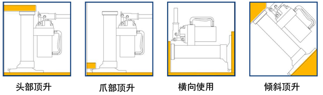 這是最常見、最直觀的用法。將低位爪式千斤頂頭部放置在需要提升的物體下方,然后通過旋轉手柄進行頂升,缸體均可360度旋轉,適用于物體底部平整且有足夠空間放置低位爪式千斤頂的情況。